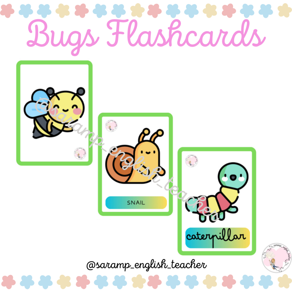 BUGS FLASHCARDS. YOU WILL FIND 2 FLASHCARDS IN EACH PAGE. A TOTAL OF 29 BUGS. THEY ARE FLASHCARDS WITHOUT TEXT, IN CAPITAL LETTER AND LOWER CASE.