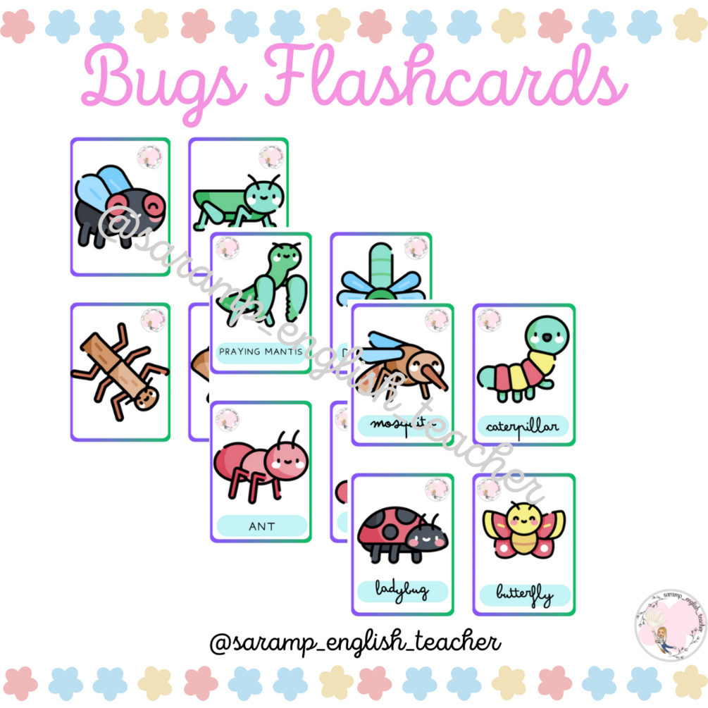 BUGS FLASHCARDS. YOU WILL FIND 4 FLASHCARDS IN EACH PAGE. A TOTAL OF 29 BUGS. THEY ARE FLASHCARDS WITHOUT TEXT, IN CAPITAL LETTER AND LOWER CASE.